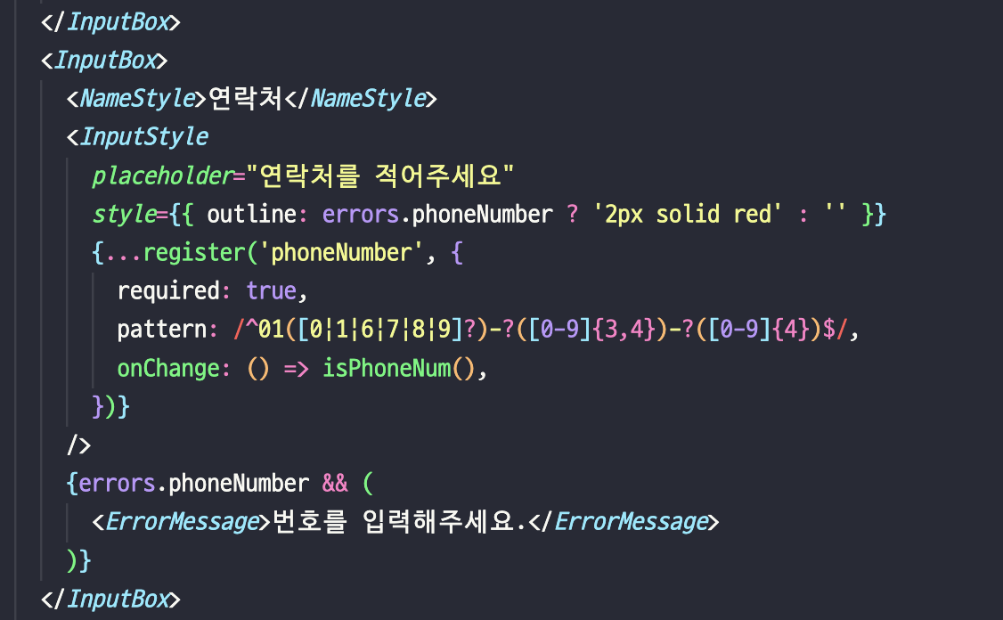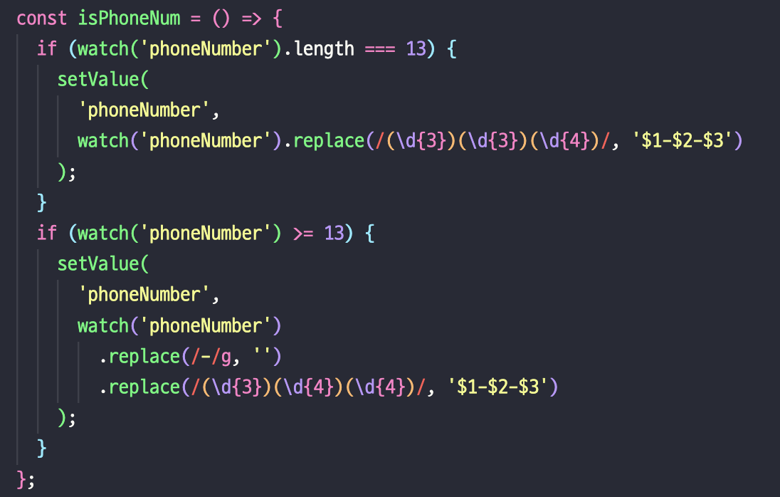 나중에 리펙토링할때는 굳이 렌더링되게끔 하지말고 Submit 버튼을 눌렀을때 하이픈(-) 에 따라 값을 바꾸어서 서버에 보내준다면 불필요한 렌더링 없이 사용할 수 있지않을까? 생각이 듭니다.