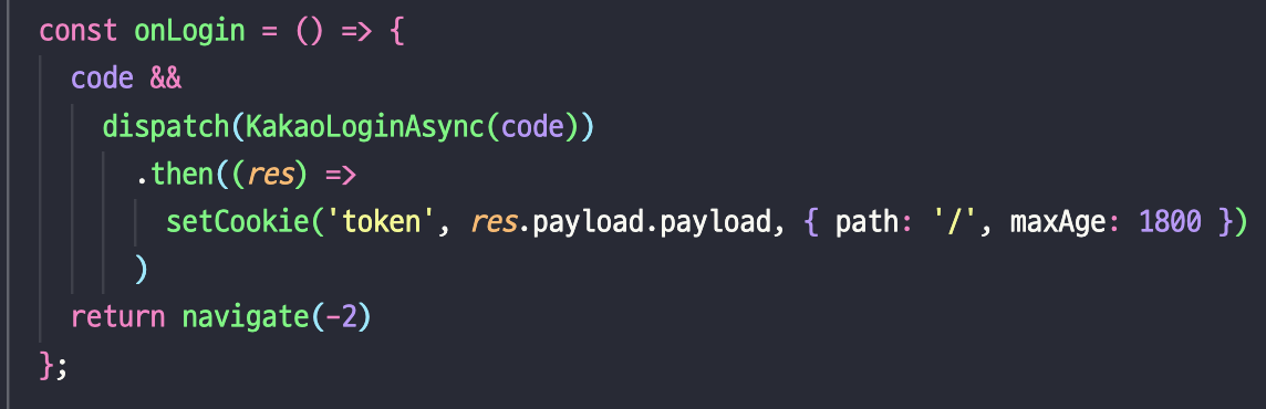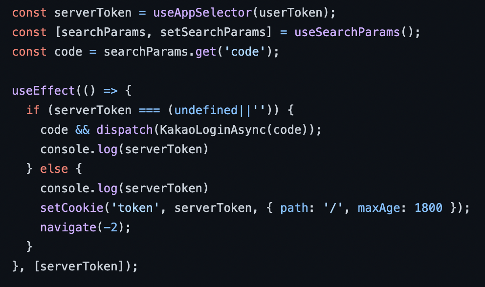 - 사실은 리팩토링 중간에 이렇게하면 분명히 되야할것 같은데 자꾸 쿠키에 토큰이 안담겼다... 아마 나의 추측이지만 쿠키가 저장되기도 전에 navigate(-2)가 실행되어서 저장이 안되었던것 같다.
